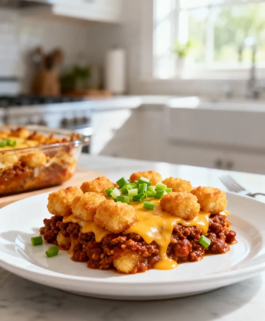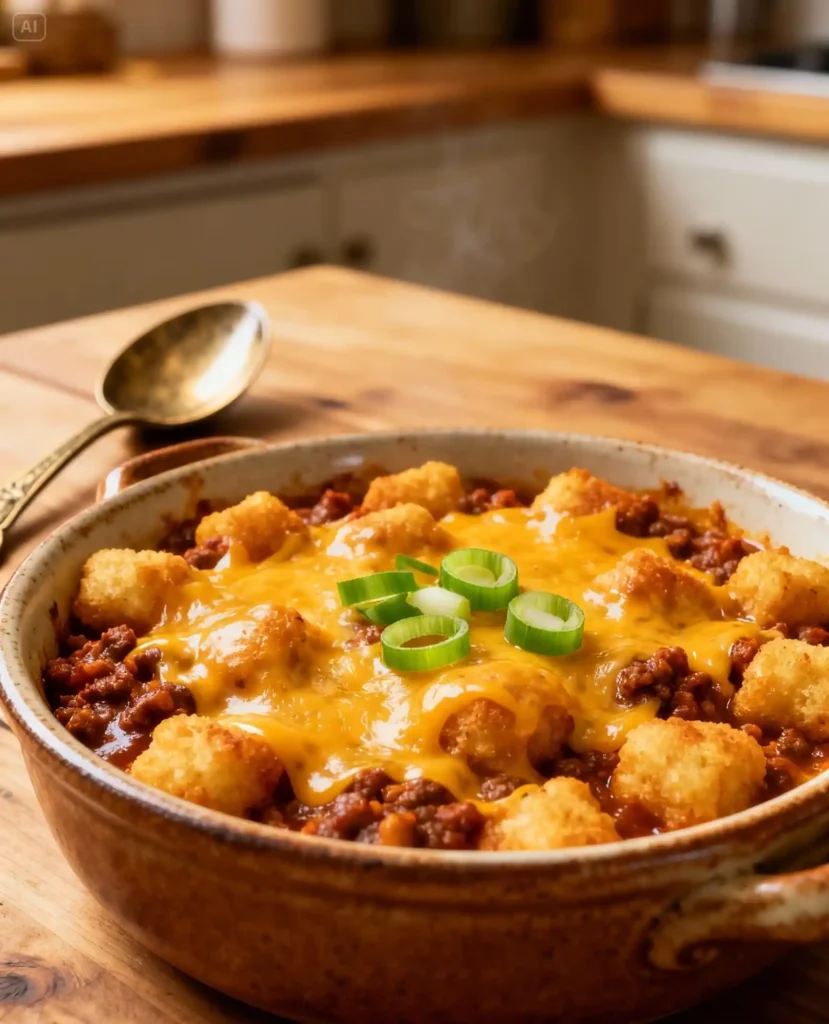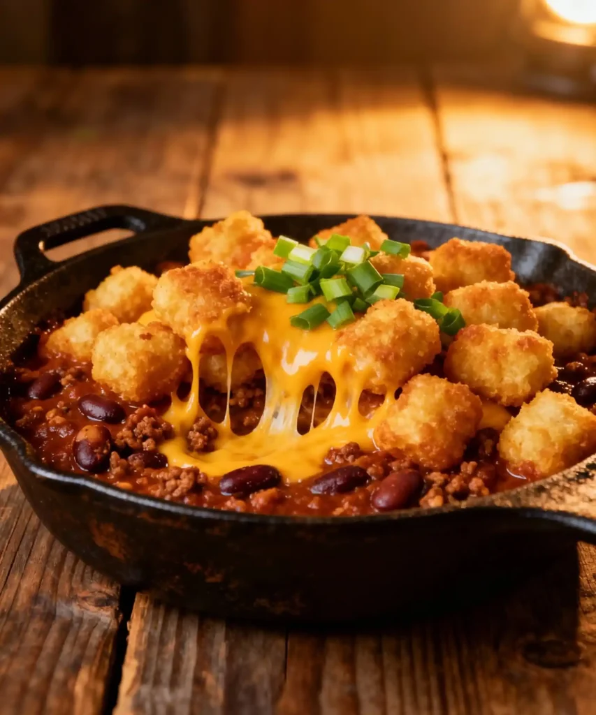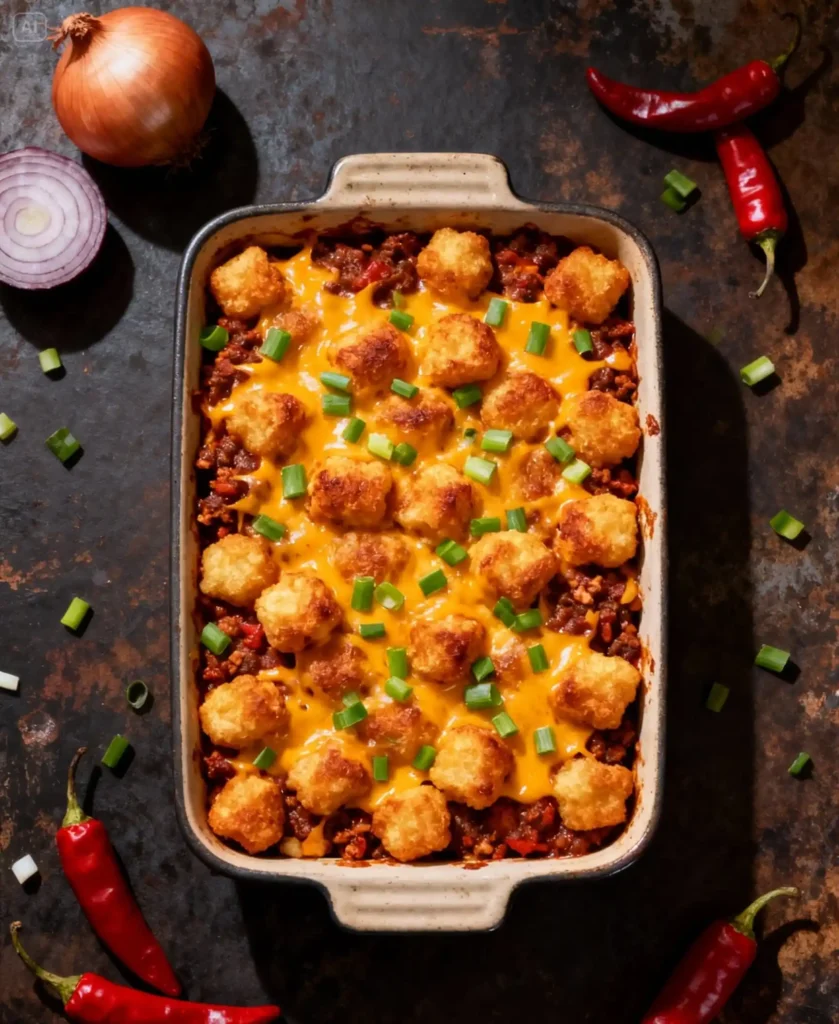 Think of a pan of hot chili, thick and rich, topped with a full layer of crunchy tater tots and a blanket of melted cheese. You scoop in and get everything in one bite. A little spice from the chili. Salty, crispy potatoes. Gooey cheese pulling as you lift the spoon.